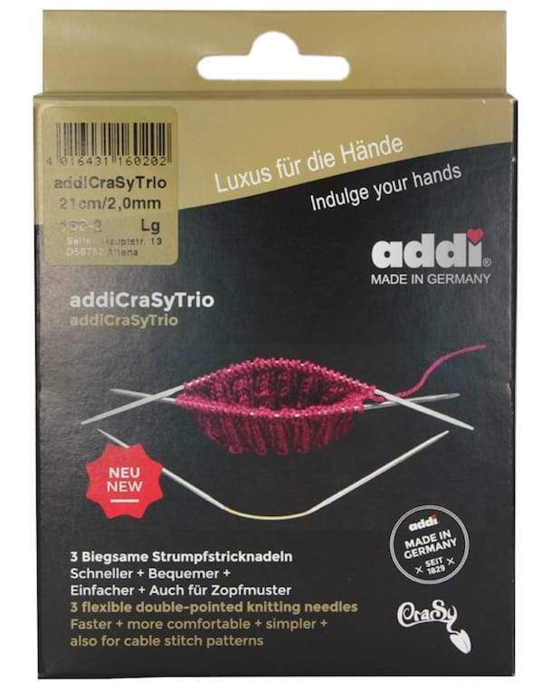 “I don’t knit socks, 5 needles are too much for my hands” – this sentence no longer applies since the introduction of the addiCraSyTrio needles. With the set of 3 flexible needles that adapt to every hand, socks, gloves, sleeves, hats etc. are very easy to knit. Just give it a try. The idea for this fantastic and patented needle set comes from knitting expert Sylvie Rasch, CraSy
